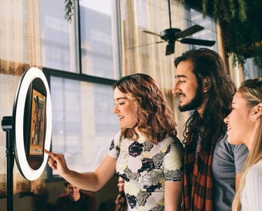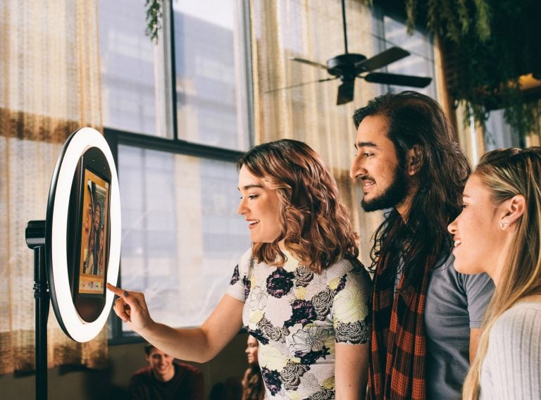 If you’re worried about fitting everyone into the frame, the Halo Selfie Booth has you covered. The booth’s open‑air design and adjustable stand make it easy for large groups to squeeze in. And because the ring light provides even lighting, everyone looks great, regardless of their position.